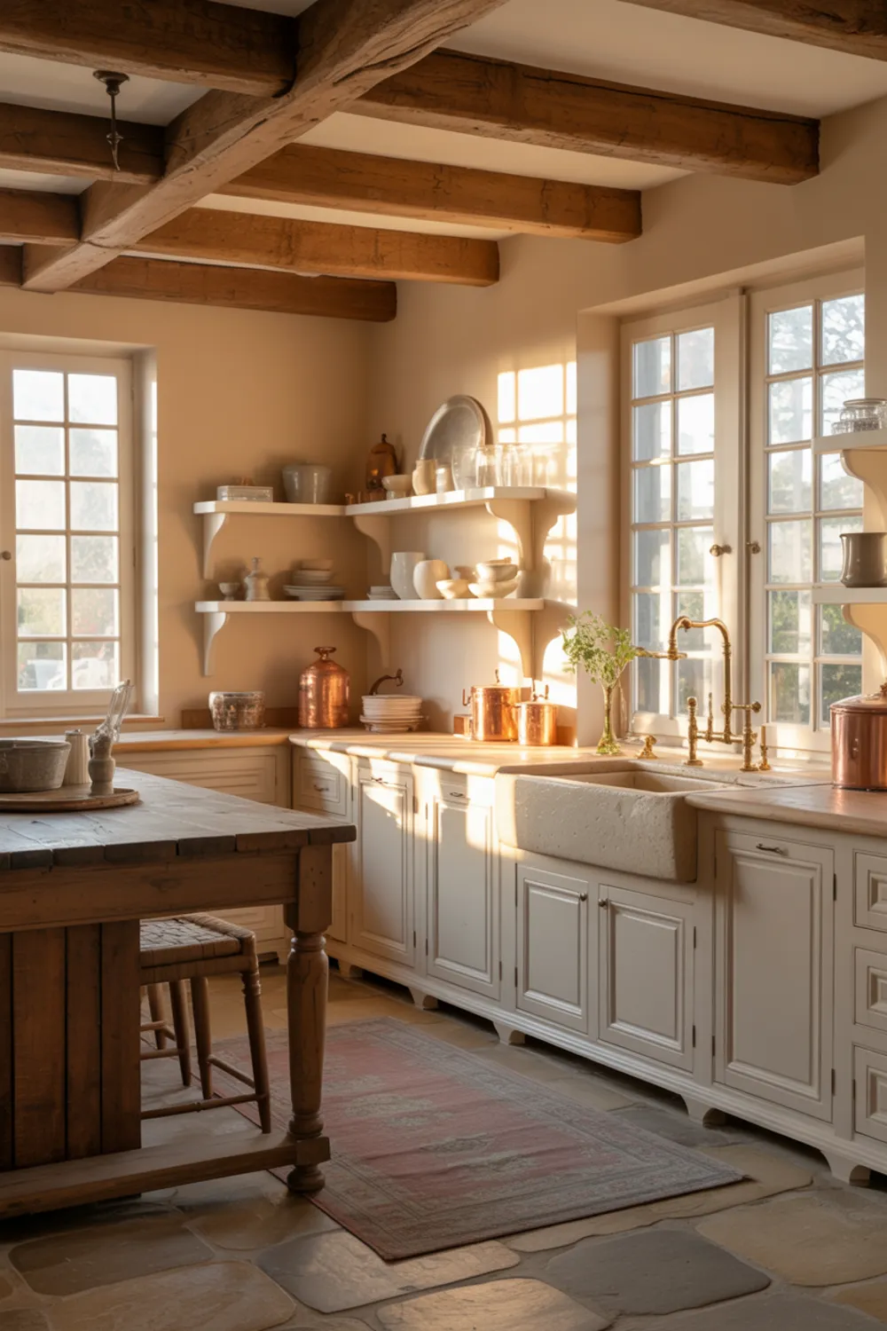 You get that cozy, lived-in feel the second you walk into a warm white French farmhouse kitchen like this. Rustic ceiling beams frame the space and make the creamy cabinets feel even softer.