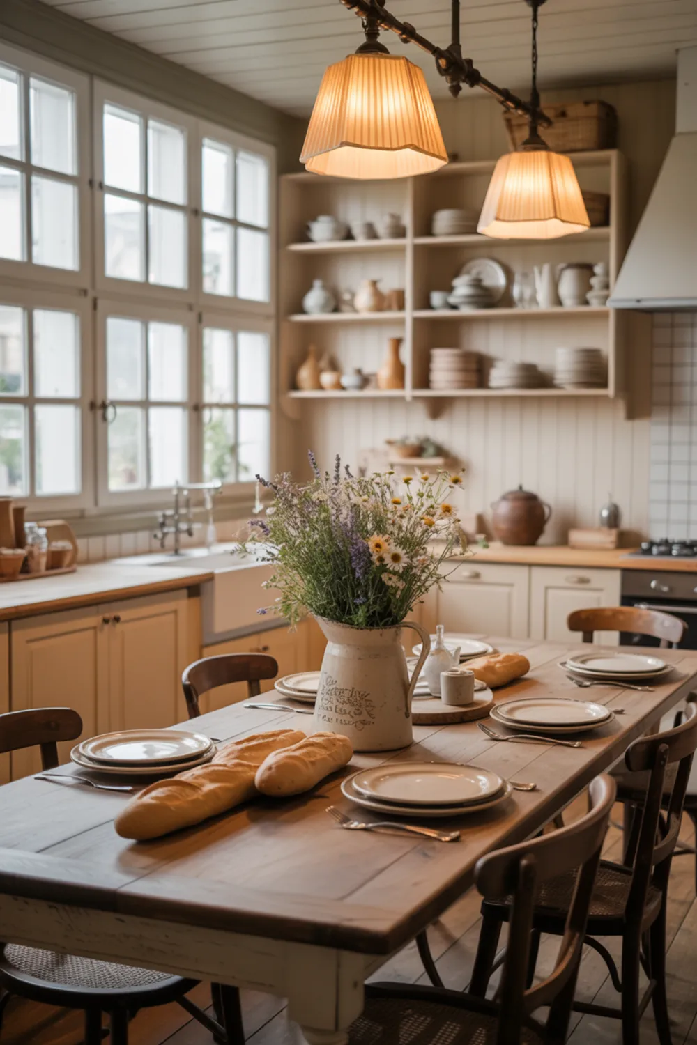 You might pair them with paneled French kitchen design farmhouse style cabinets, a stone arch over the range, and a long table in the center. Add linen curtains, copper pots, and ceramic sinks for extra charm.