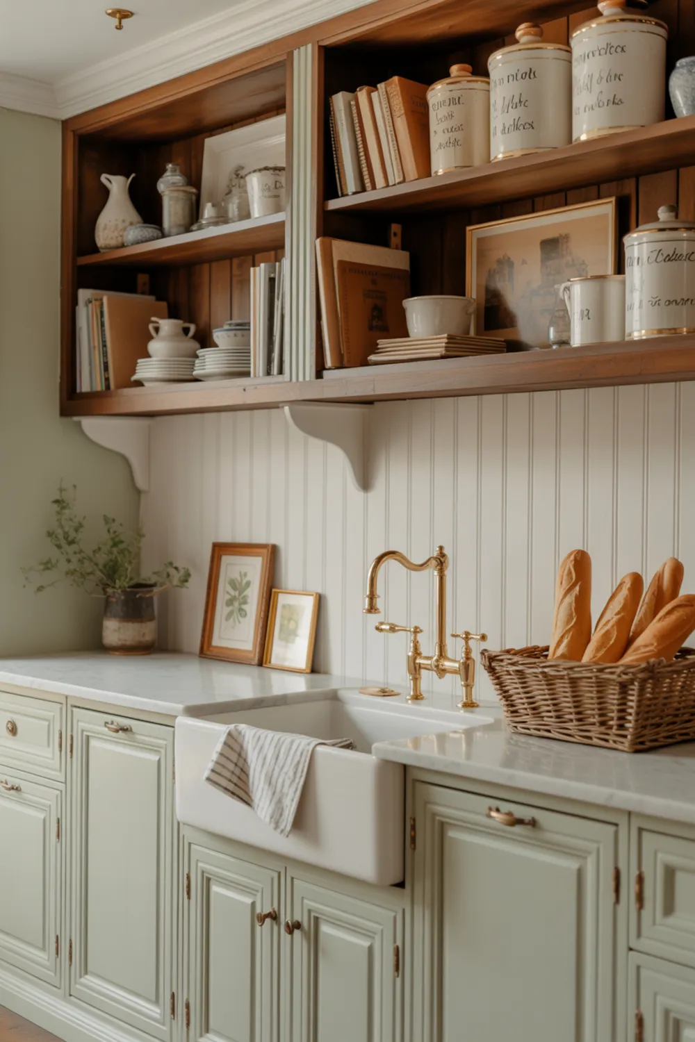11. Sage Green French Country Cabinets with Curated Open Shelves