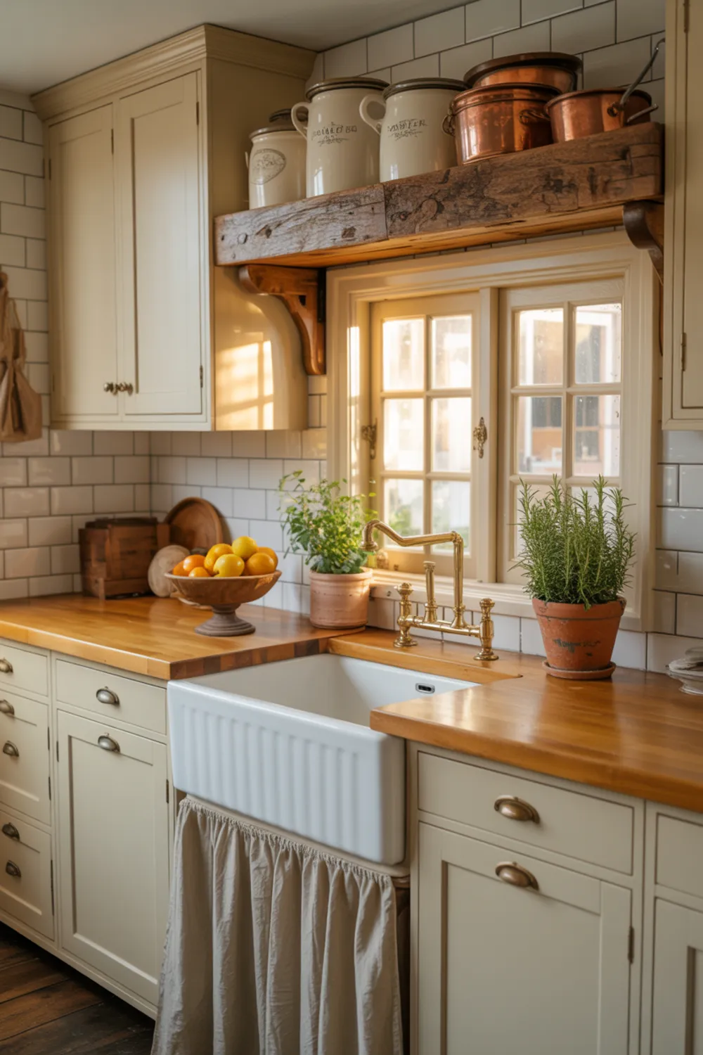 You might pair butcher block with a deep farmhouse sink, skirted base, and a simple French cottage backsplash. Try adding herbs in clay pots and a few vintage dishes on open shelves.