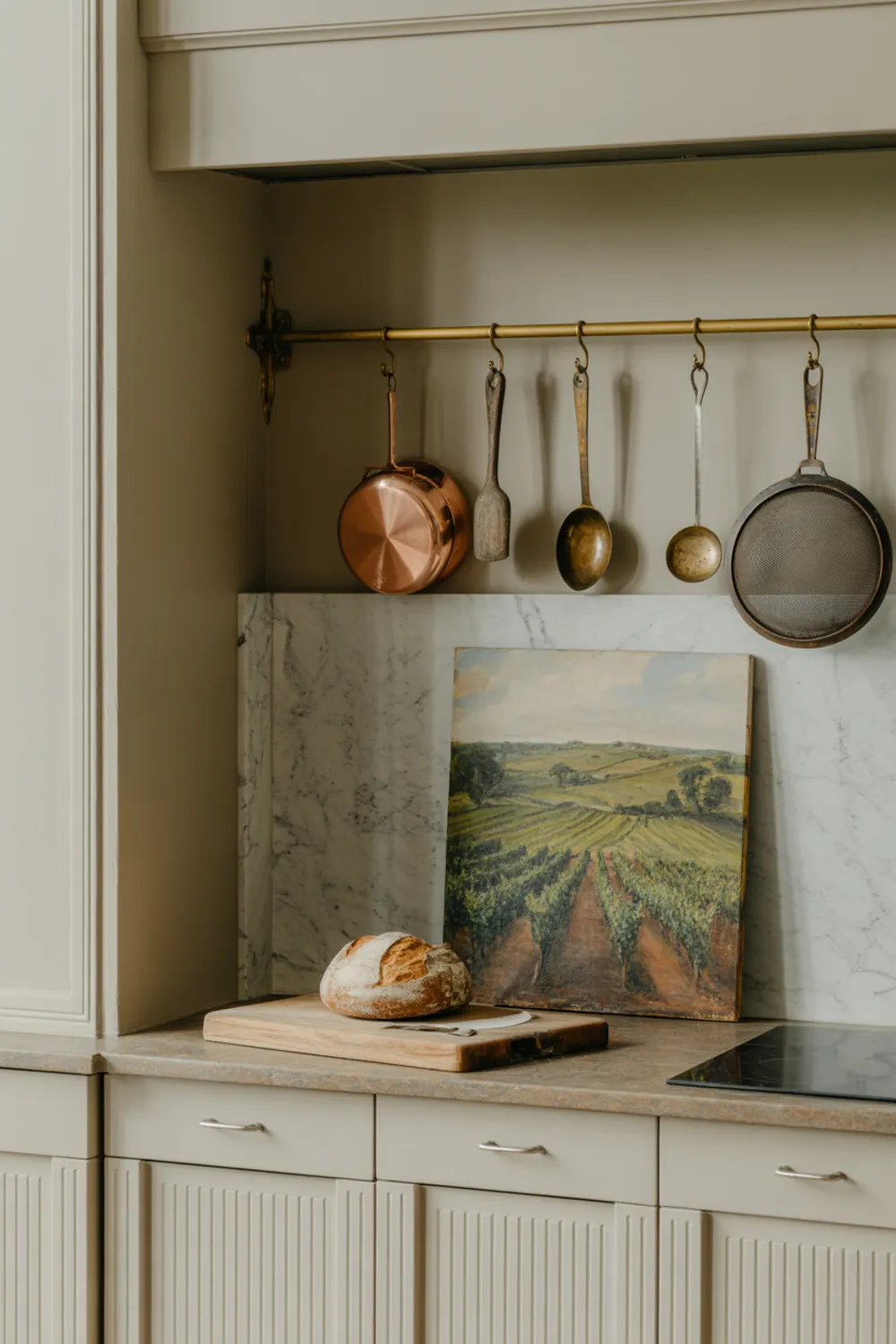 A slim brass rail is a small change that gives you big French kitchen aesthetic energy. Rather than stuffing utensils into drawers, you hang copper pots, wooden spoons, and strainers where you can see them.
