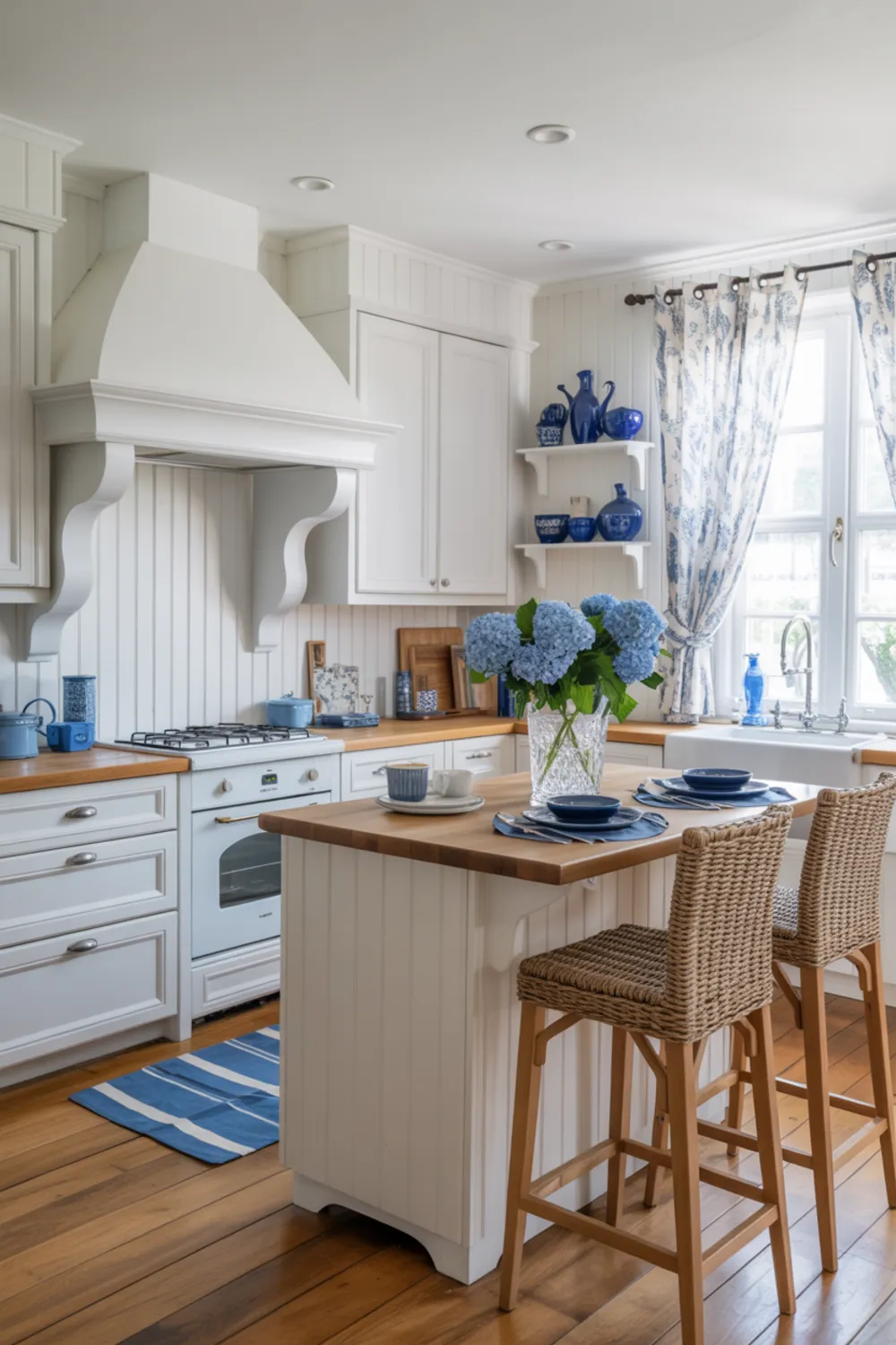 14. Bright White French Country Kitchen with Blue Accents