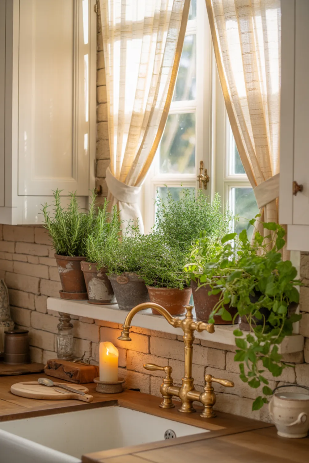 A deep French country kitchen window sill gives you the perfect spot for plants and small decor. When you line it with herbs, candles, and terracotta pots, the sink area becomes a little sanctuary.
