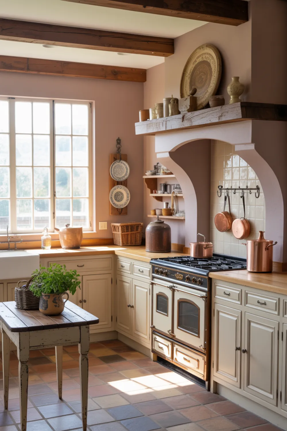You might pair this with terracotta floors, soft taupe cabinets, and a farmhouse table for daily meals. Add copper pots, plate racks, and art to echo French decor kitchen style.