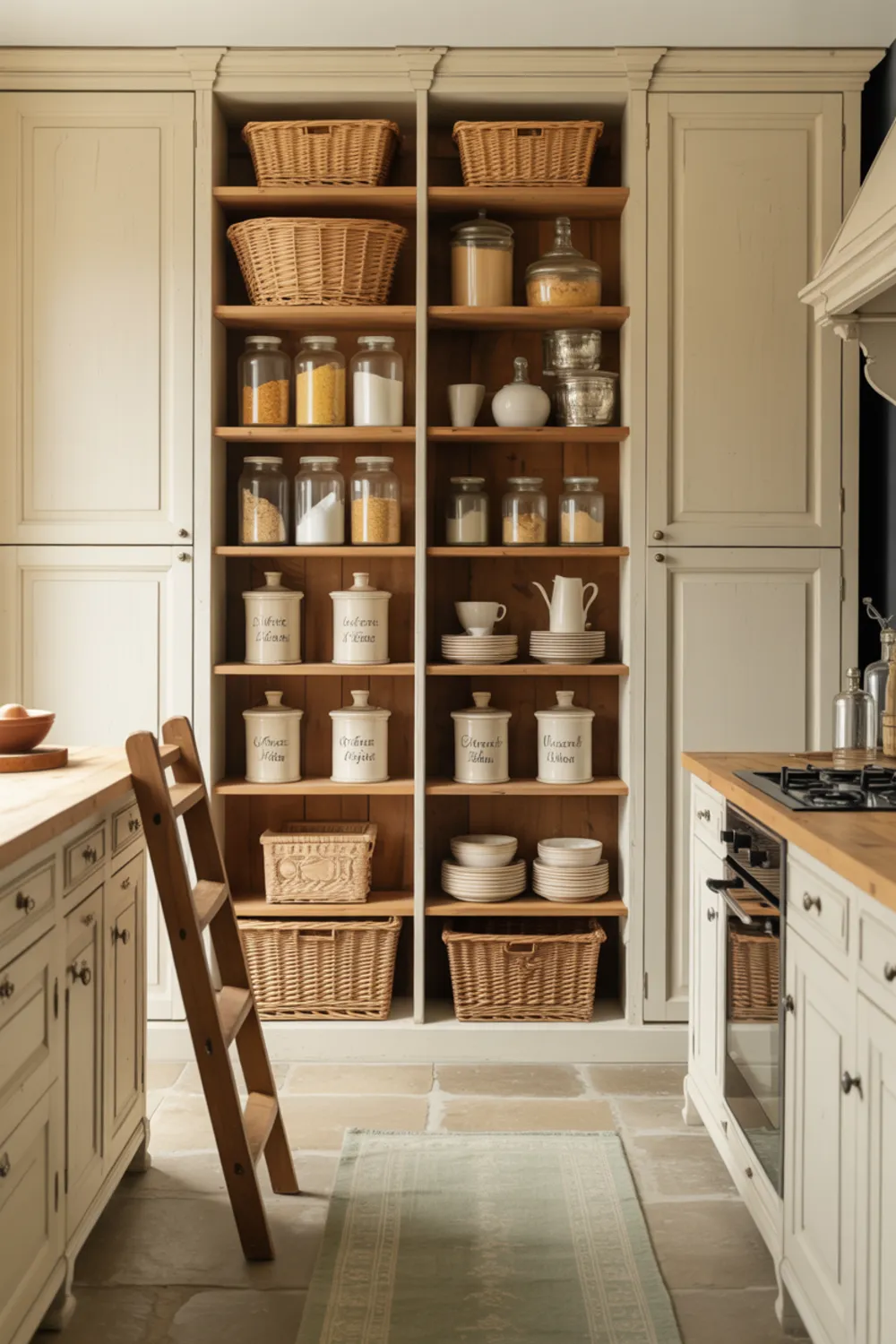 A pantry wall designed with open shelves and baskets turns French country kitchen storage into decor. Instead of hiding everything, you sort staples into jars and French country kitchen canisters, then line them up neatly.