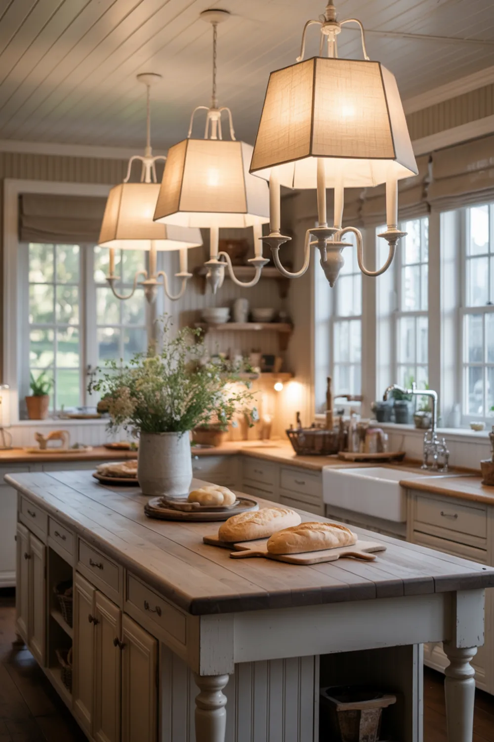 19. White French Country Chandeliers Over Rustic Island