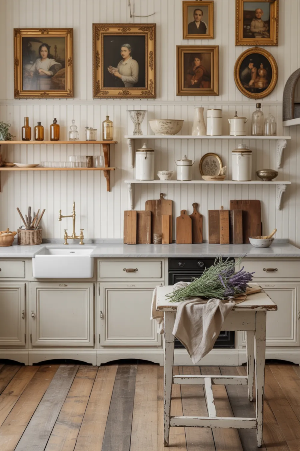 A curated kitchen in French country style interior feels collected over time, not bought in one weekend. Instead of filling every cabinet, you display antiques, art, and crockery on open shelves.