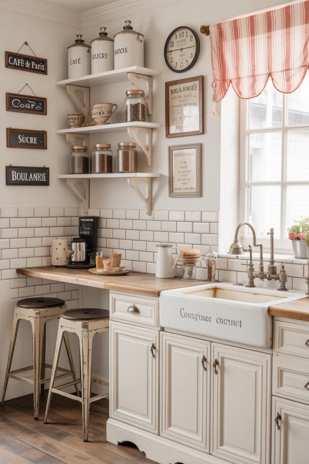 A French theme kitchen with café vibes is such a fun way to dress up a small space. When you hang antique French signs for home, add labeled French country kitchen canisters, and tuck in a narrow counter with stools, the room feels like a tiny bistro.