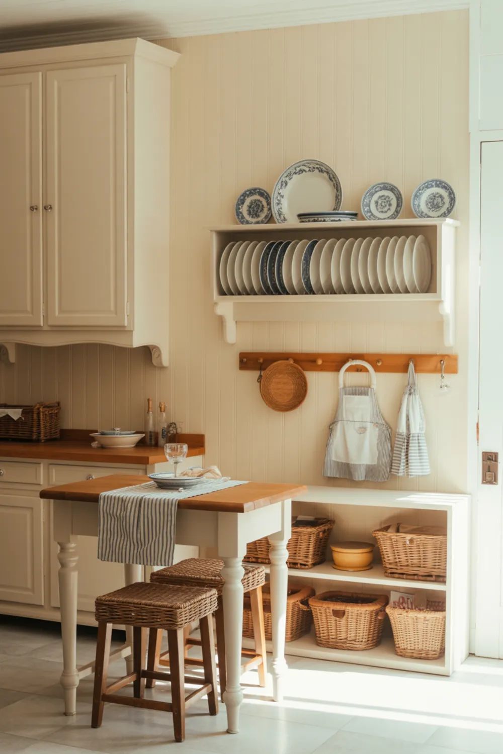 Beadboard and a plate rack give your space instant cottage house kitchen ideas charm. Instead of plain walls, you get texture that feels cozy and timeless.