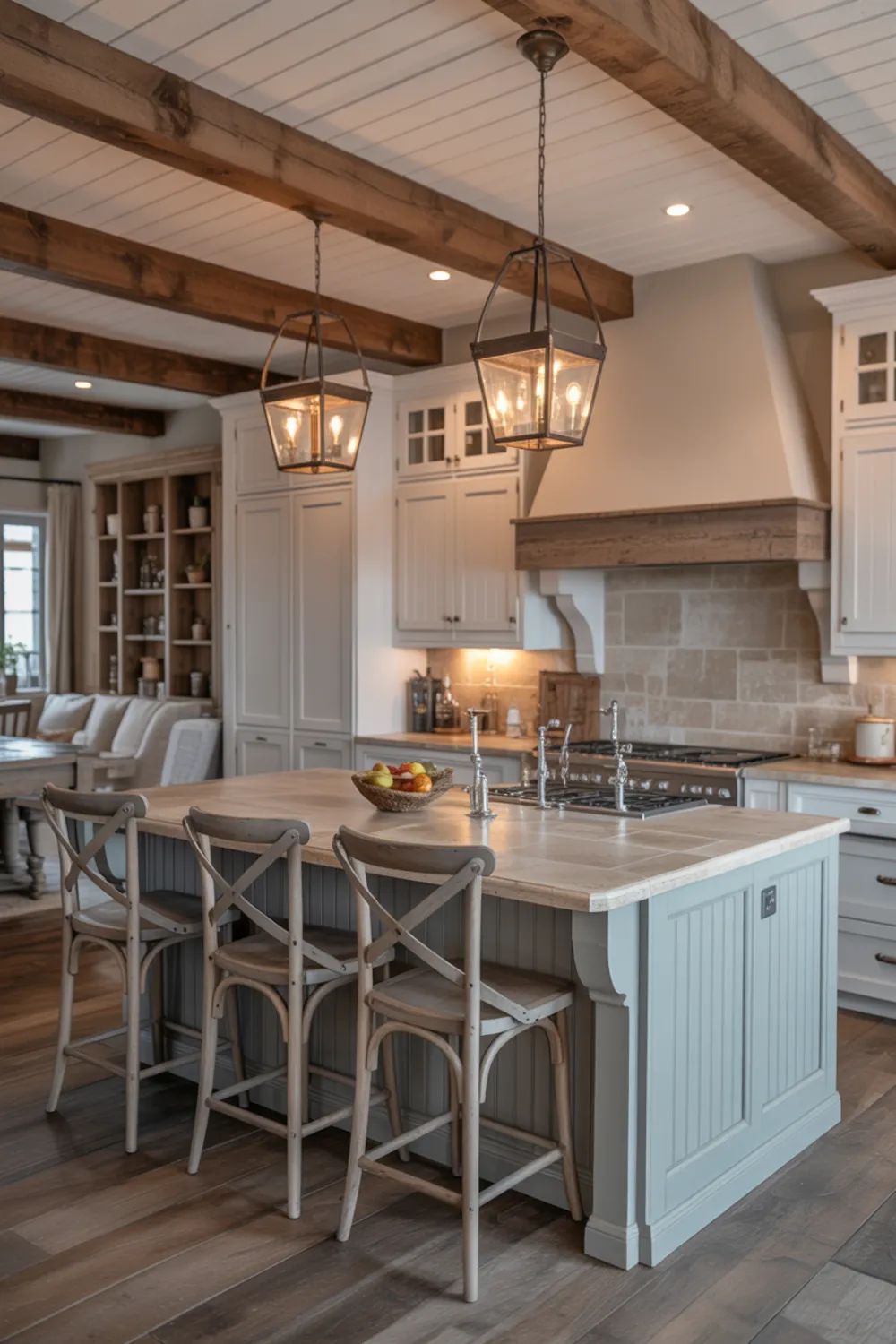 An open layout lets your country French kitchen flow right into the living space. A large island with seating anchors the room and becomes the hub for snacks, homework, and casual meals.
