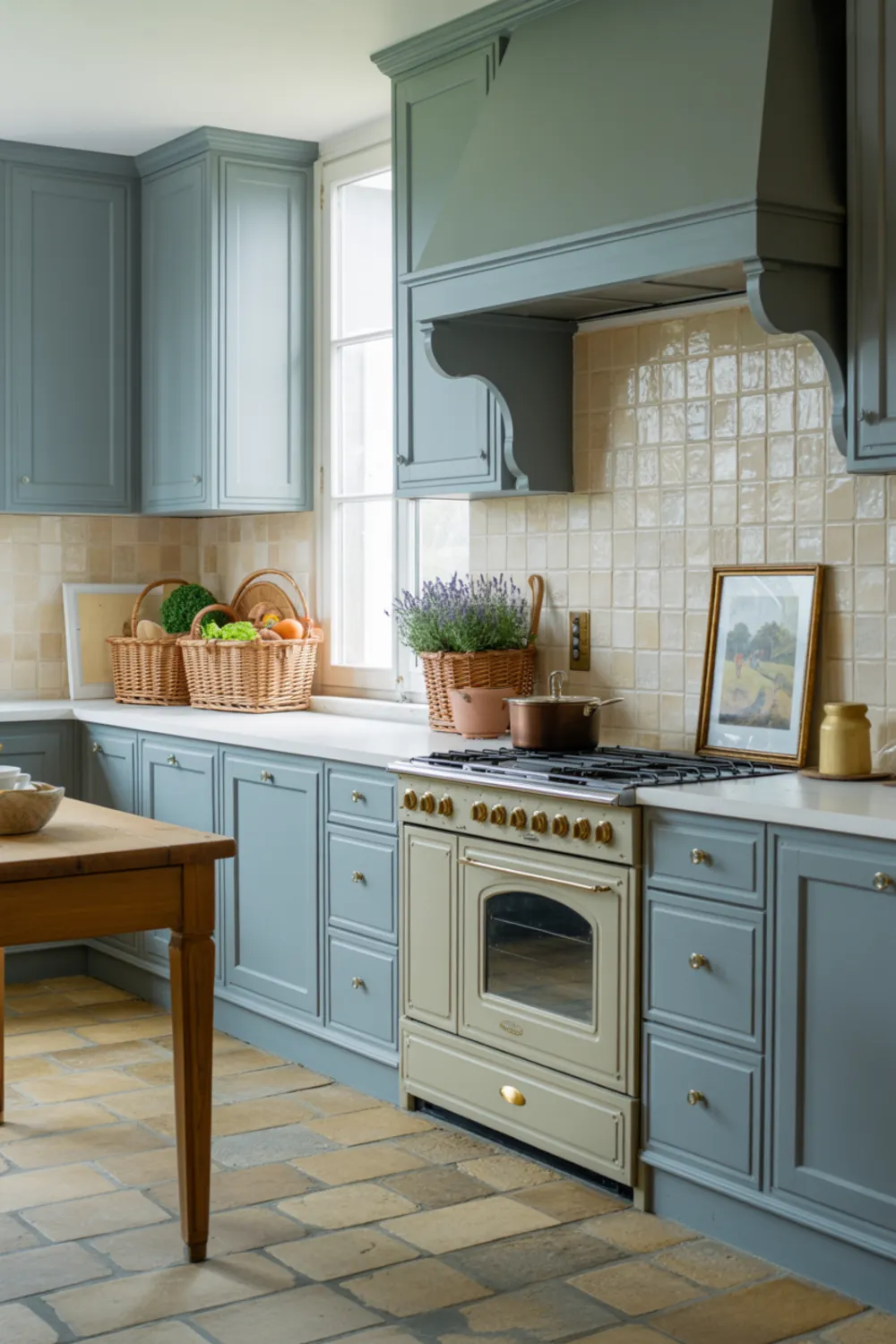 3. Soft Blue French Country Cabinets and Tumbled Stone Floors