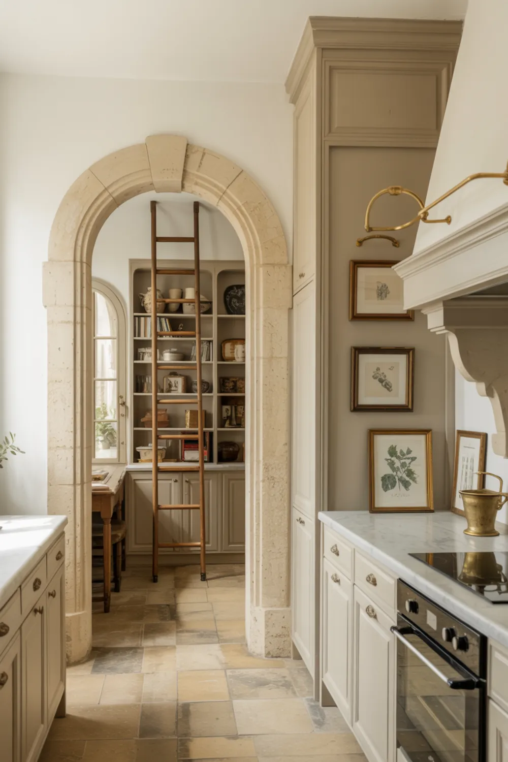 You might add a ladder, marble counters, and brass rails for extra charm. Keep the palette soft with stone, linen, and warm white.