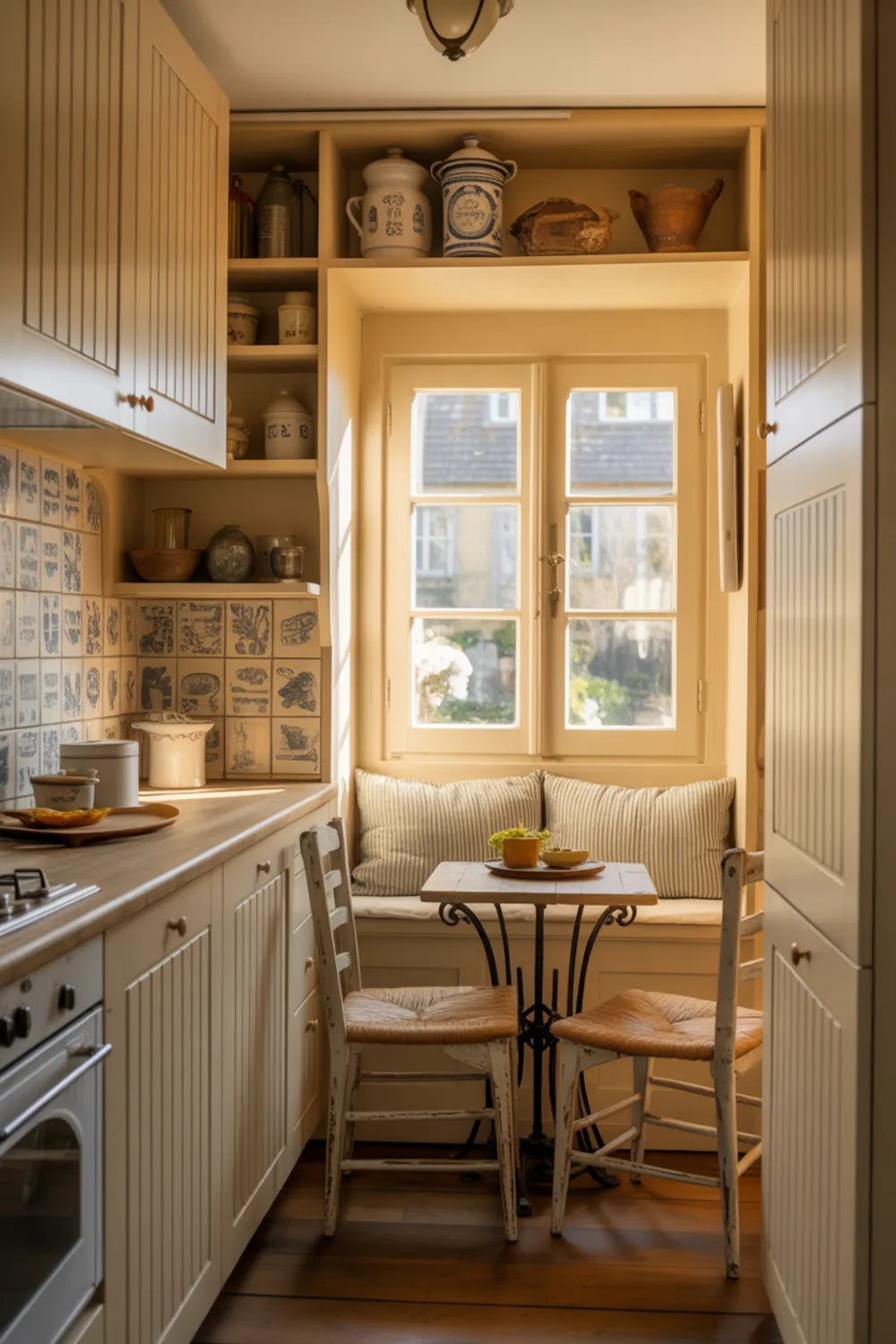 Even a tiny small French country kitchen can feel dreamy when you tuck in a little eat-in nook. A slim bistro table and a couple of vintage chairs at the end of a galley layout make space for slow breakfasts.
