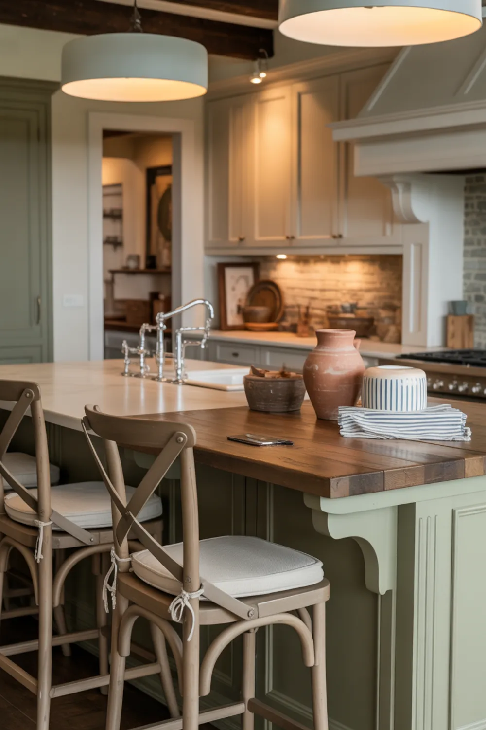 You can bring this look home by painting your island a soft sage and choosing stools with natural textures. Overhead, modern French country kitchen pendant lights & chandeliers add a gentle glow.