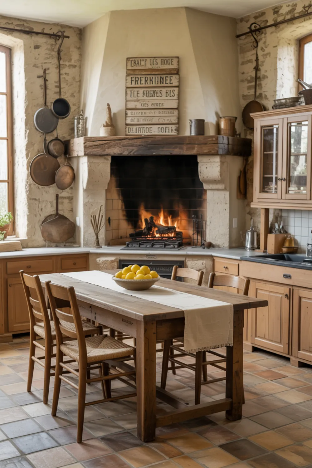 A little stone fireplace in your rustic French farmhouse kitchen instantly changes the mood. Instead of feeling like just a cooking space, the room turns into a cozy hangout.