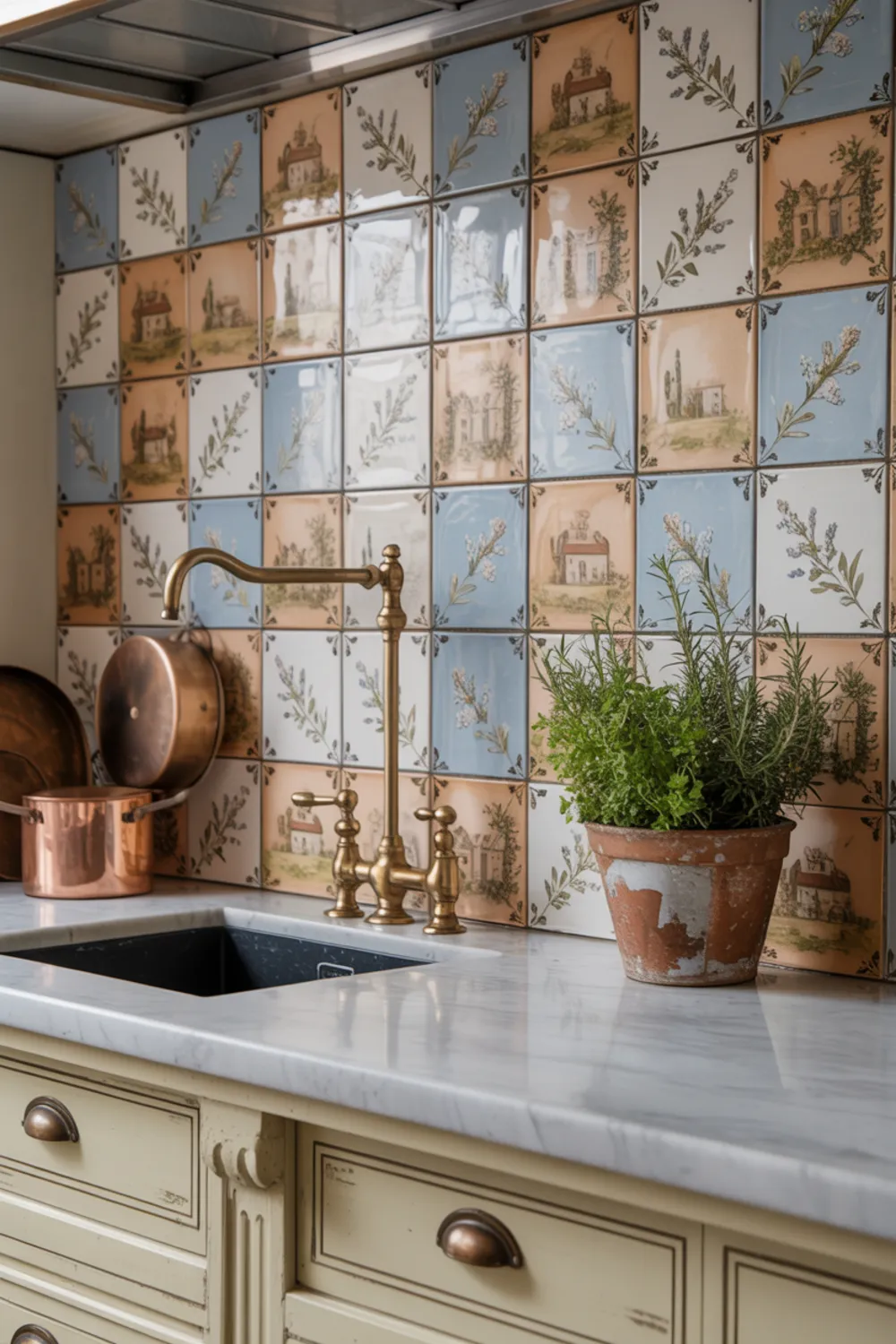 Hand-painted tiles can turn your French country kitchen backsplash into the star of the room. Soft blues, creams, and terracotta tones add personality without shouting.