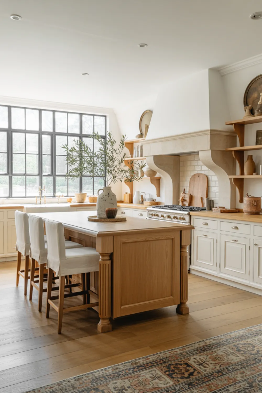 You could bring in stoneware, baskets, and dried herbs to echo old-world French farmhouse style. Try a chunky farmhouse countertop on the island and a vintage rug for softness underfoot.