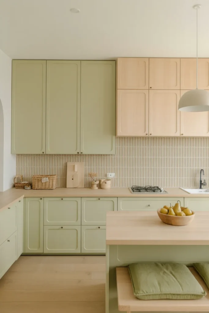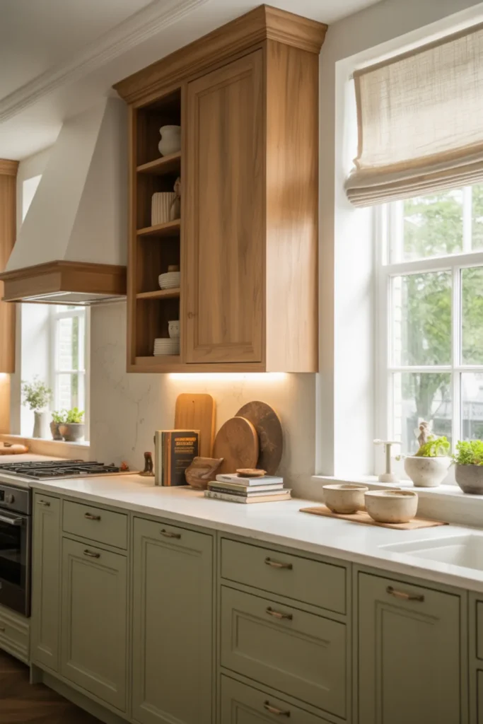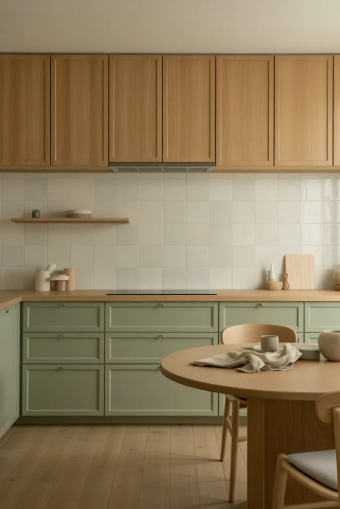 Green lowers bring color without taking over the whole room, and natural wood uppers keep everything feeling warm and open. Go for sage green cabinets on the bottom with white oak uppers if you want that calm, earthy kitchen vibe.