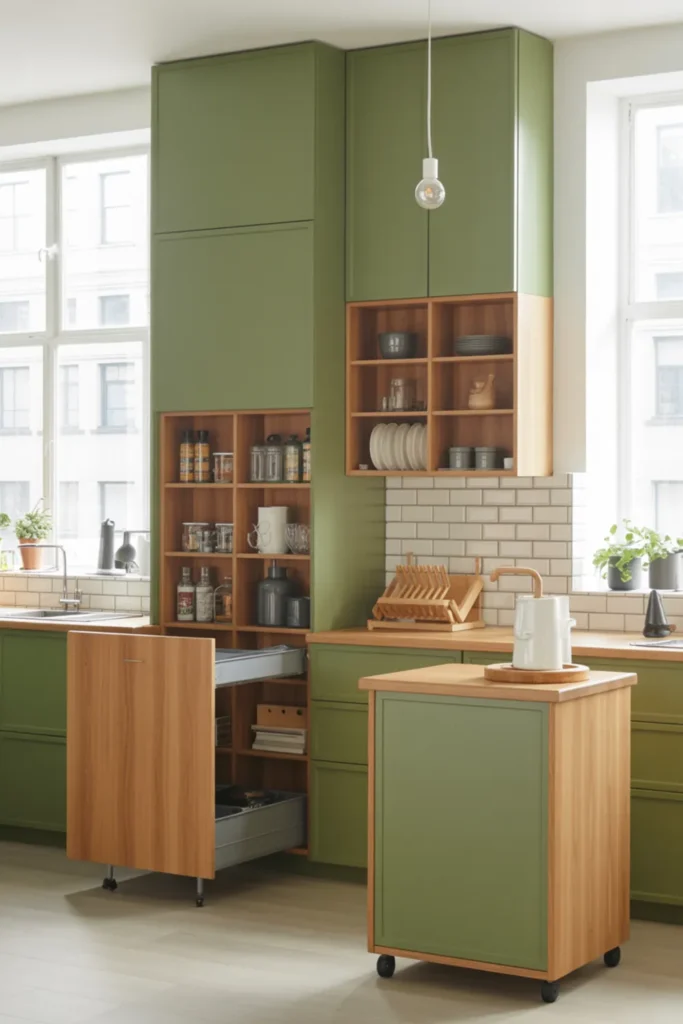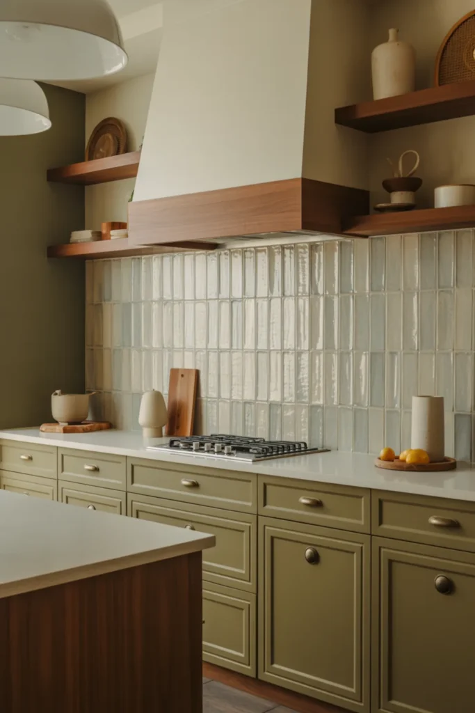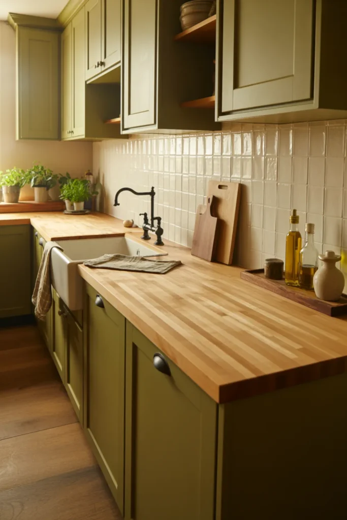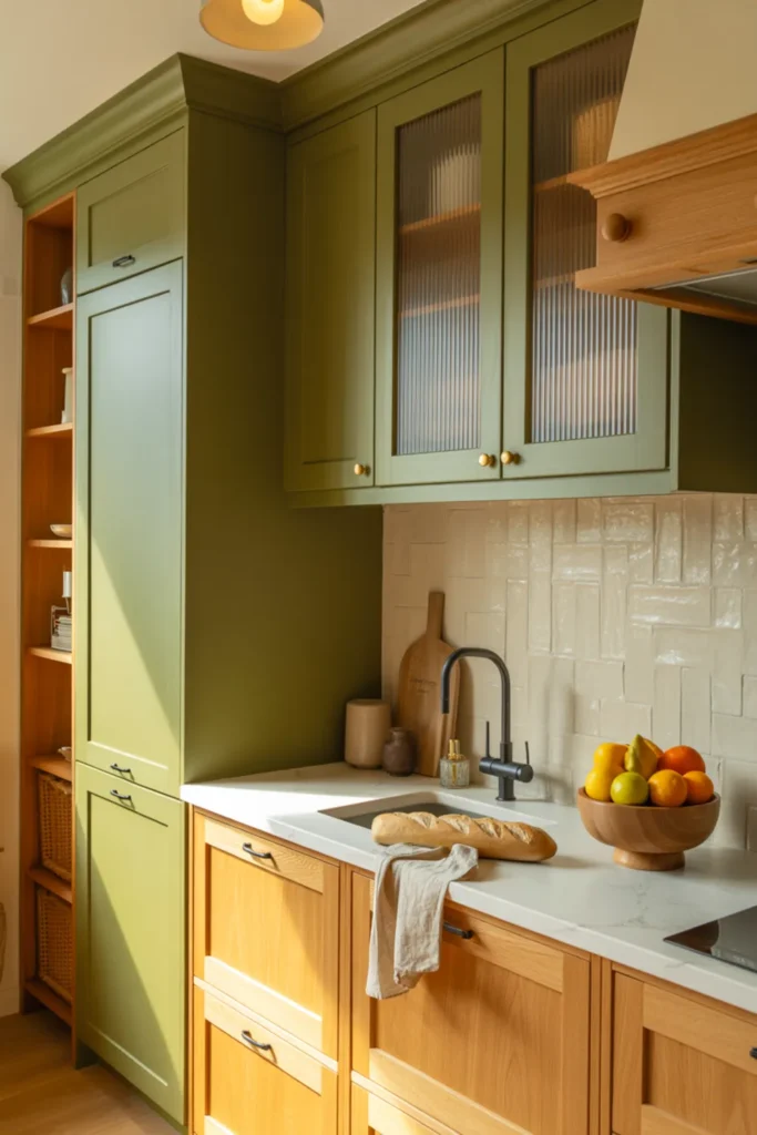Choose olive green cabinets for a cozy look, or go softer with sage green. A creamy backsplash helps everything blend, and fluted glass doors add texture without clutter.