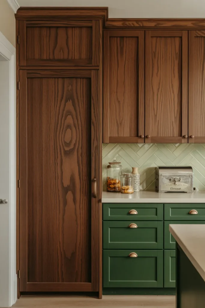 A stain-and-paint combo is a smart way to get green and wood kitchen cabinets without committing to all painted or all stained. Use dark green lowers, then keep uppers in stained oak so the room feels open.