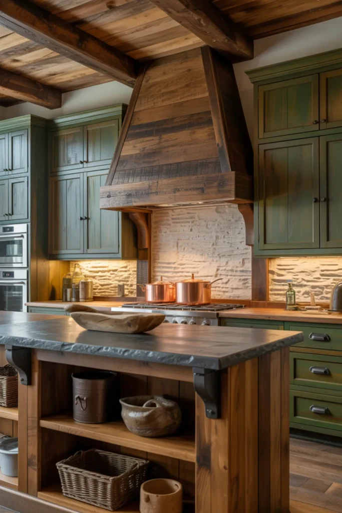 Rustic green kitchen cabinets feel bold, but wood beams soften everything and make it feel like a retreat. Choose moss-green lowers and add reclaimed beams overhead for instant warmth.