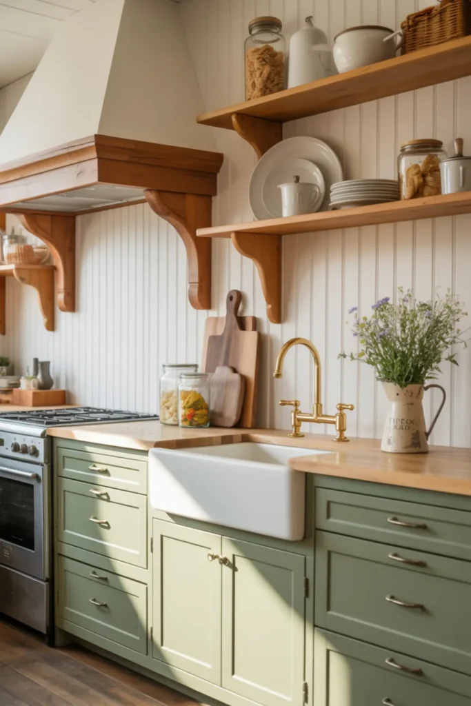 Green farmhouse kitchen cabinets pair beautifully with natural wood open shelves because the mix feels relaxed and lived-in. Sage green Shaker fronts work with almost any home style, especially with a white apron sink.