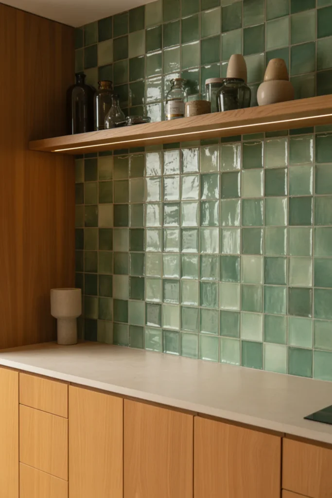 You can mix green cabinets, wood accents, and a statement green tile backsplash without it looking too matchy. Use olive cabinets, then choose a backsplash with texture, like scalloped or geometric pattern tile in a deeper green.