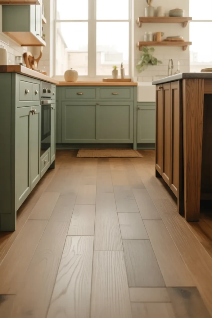 Matching your wood floors to your wood accents makes green kitchen cabinets look instantly more expensive. Choose a warm white oak floor, then repeat that same undertone in shelves or an island detail.