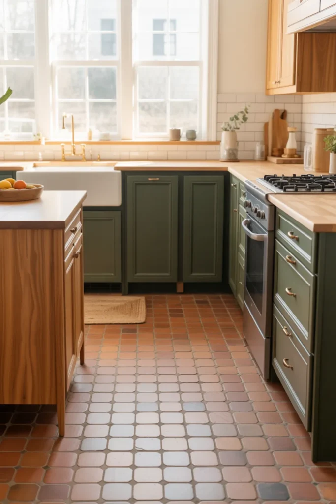 This is where your kitchen can look โdesignedโ instead of random. Pair deep green lowers with natural wood uppers, then choose a floor that ties both together, like warm terracotta-look tile or a honey-toned wood floor.