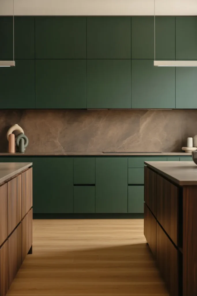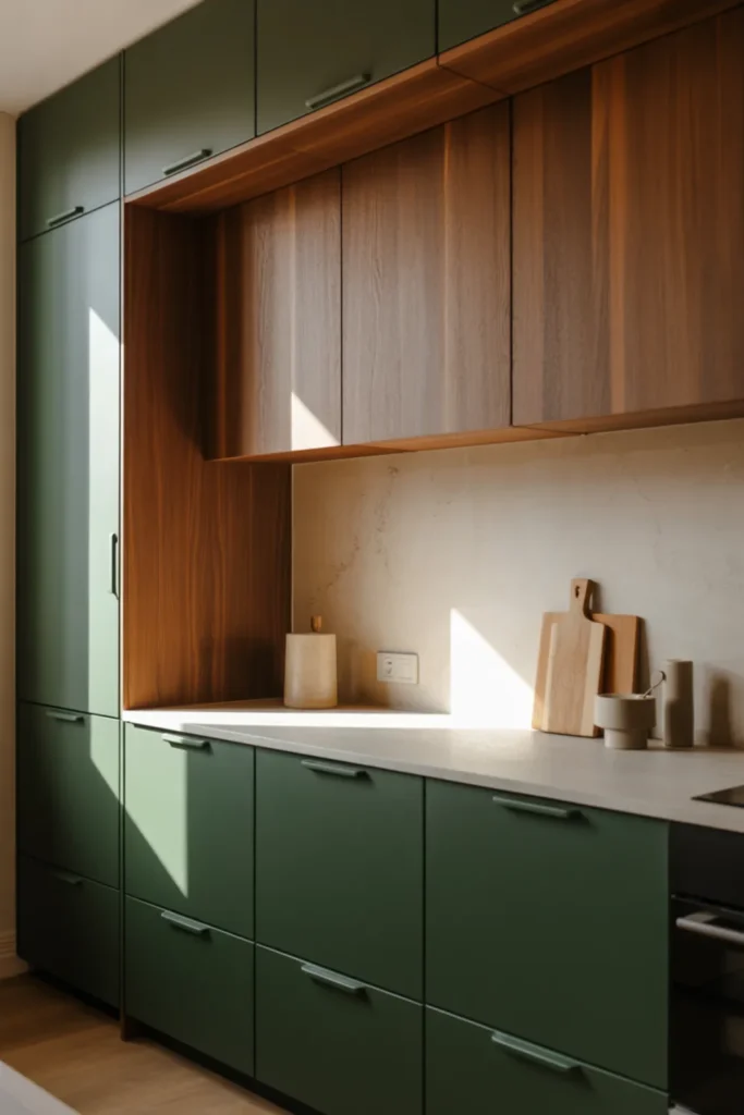 You can go modern without losing warmth by mixing matte green cabinets with sleek walnut wood grain. Handleless slab fronts keep it clean, while a thin brown stone counter adds depth.