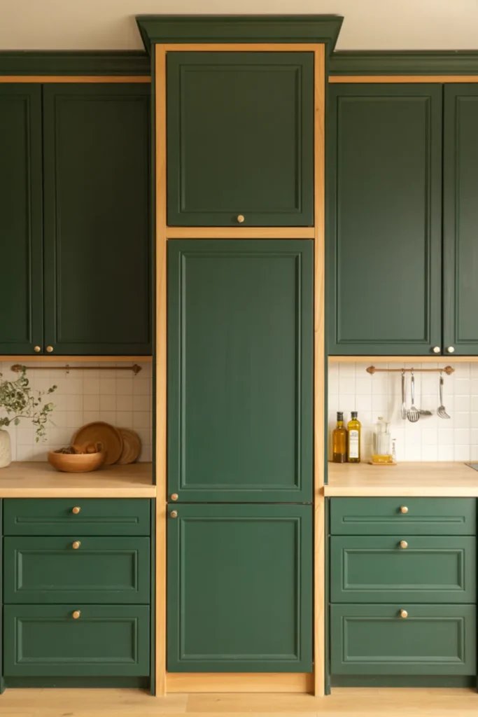Deep green cabinets can feel custom when you add small natural wood trim details. Think wood edge banding, wood toe-kick wraps, or a wood frame around a tall pantry.