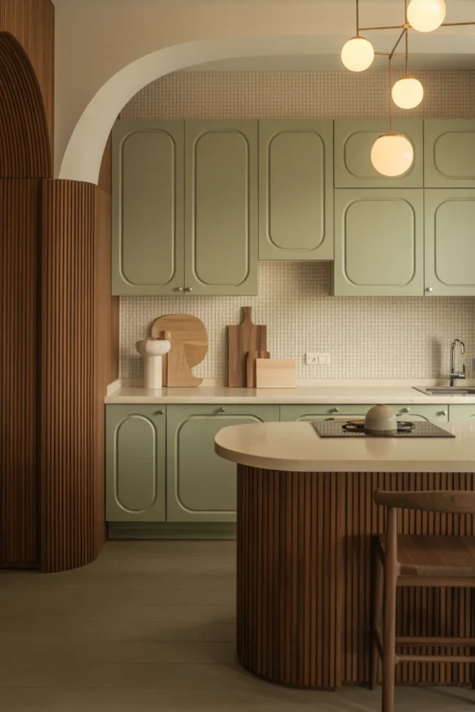 Curved corners make green and wood kitchen cabinets look more custom and less boxy. Try muted green base cabinets with rounded end panels, then wrap the island in vertical slatted wood for texture.