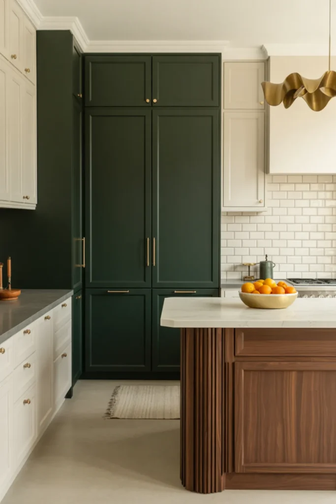 Leather pulls or small brass knobs add a handcrafted feel. If you want extra depth, add a reeded wood pantry door next to the green run. Under-cabinet lighting will make both finishes look richer.