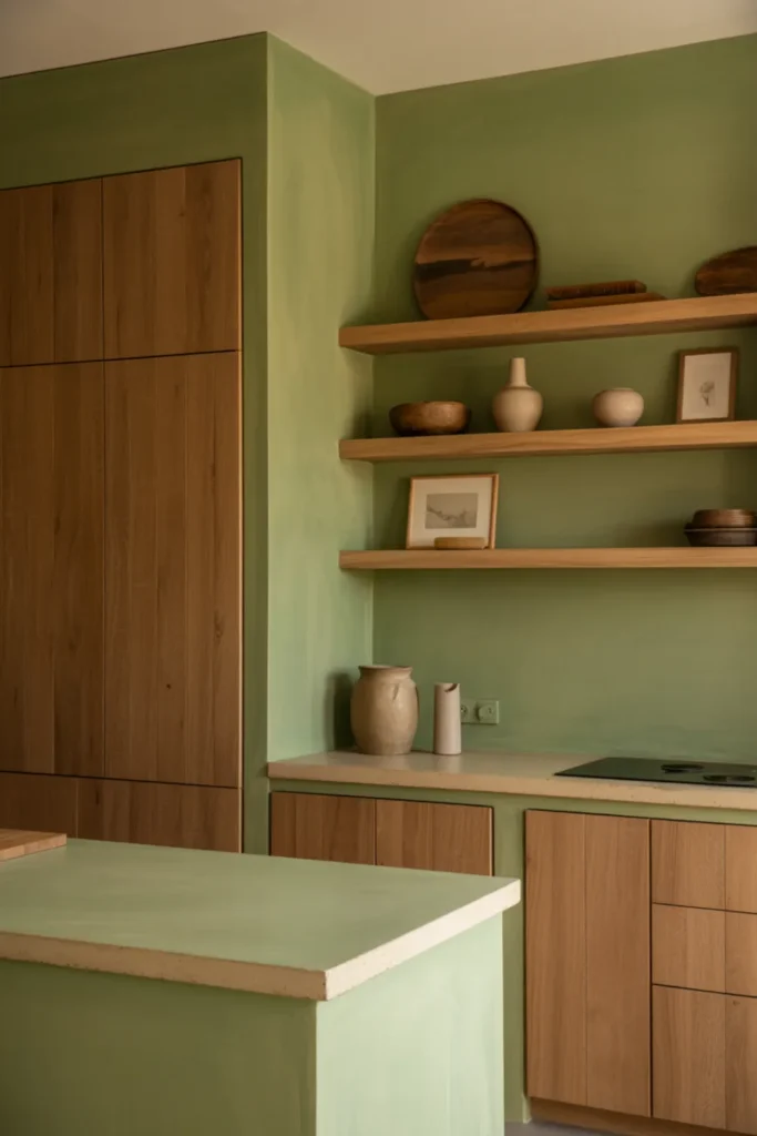 Green kitchen walls with wood cabinets looks bold, but it can still feel calm if you keep the green muted. Use a sage limewash wall finish, then choose natural oak cabinets so the grain stands out.