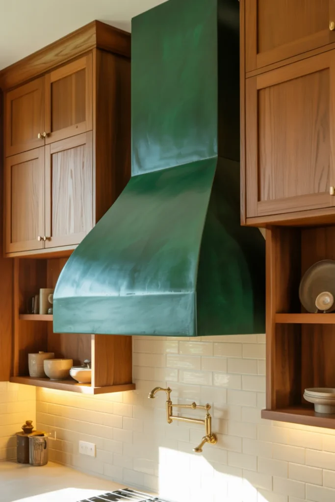 31. Green Range Hood as a Bold Accent With Wood Cabinets