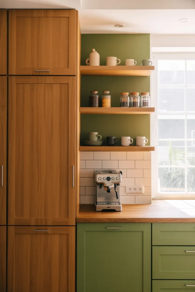 You donโt need a whole green kitchen to enjoy the look. Try a small green accent zone, like a coffee station, while the rest stays wood.
