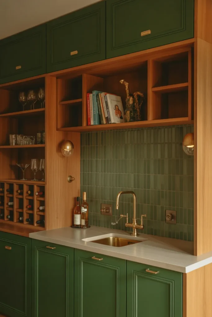 A green and natural wood wet bar makes your kitchen feel more complete, even if itโs small. Use rich green lower cabinets and natural oak shelves or side panels to keep it warm.