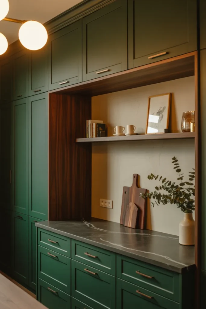 4. Forest Green Cabinets Paired With Walnut Warmth