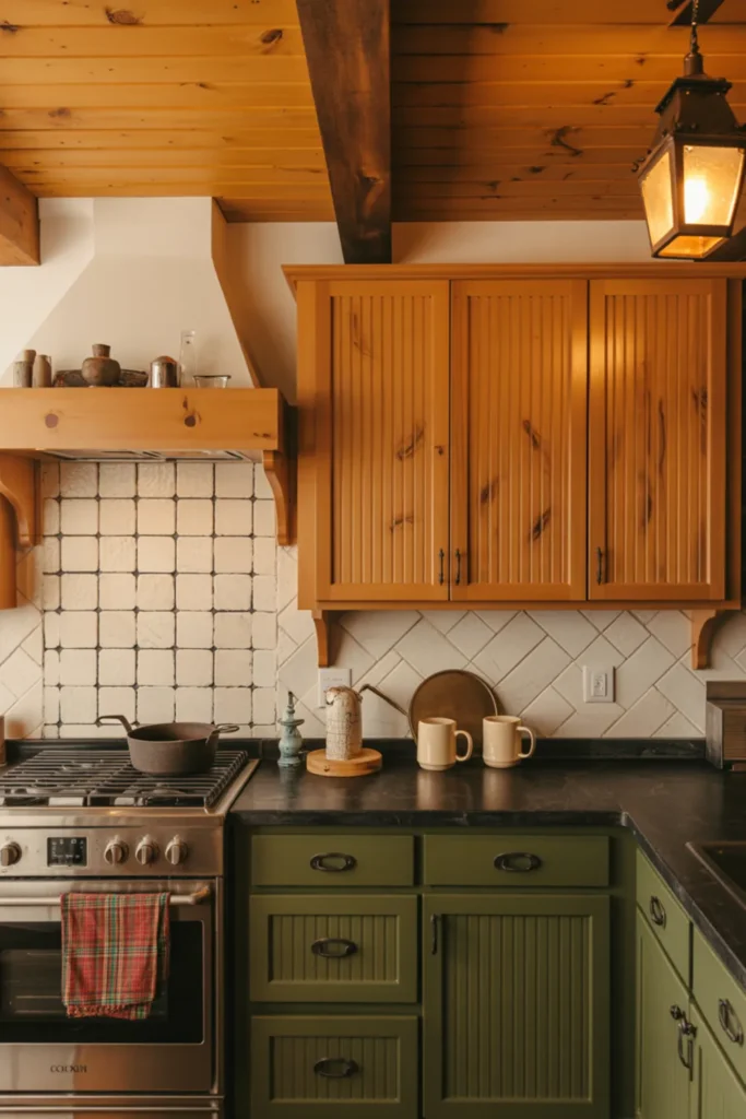 Black iron pulls keep the cabin vibe sharp, and warm lantern-style pendants make the wood look richer. Choose an off-white tile backsplash so the colors donโt fight.