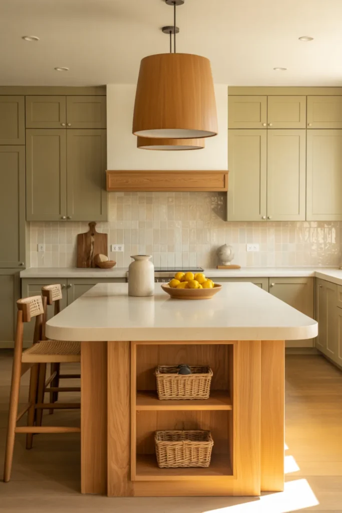 3. Olive Green Cabinets With Warm Oak Accents
