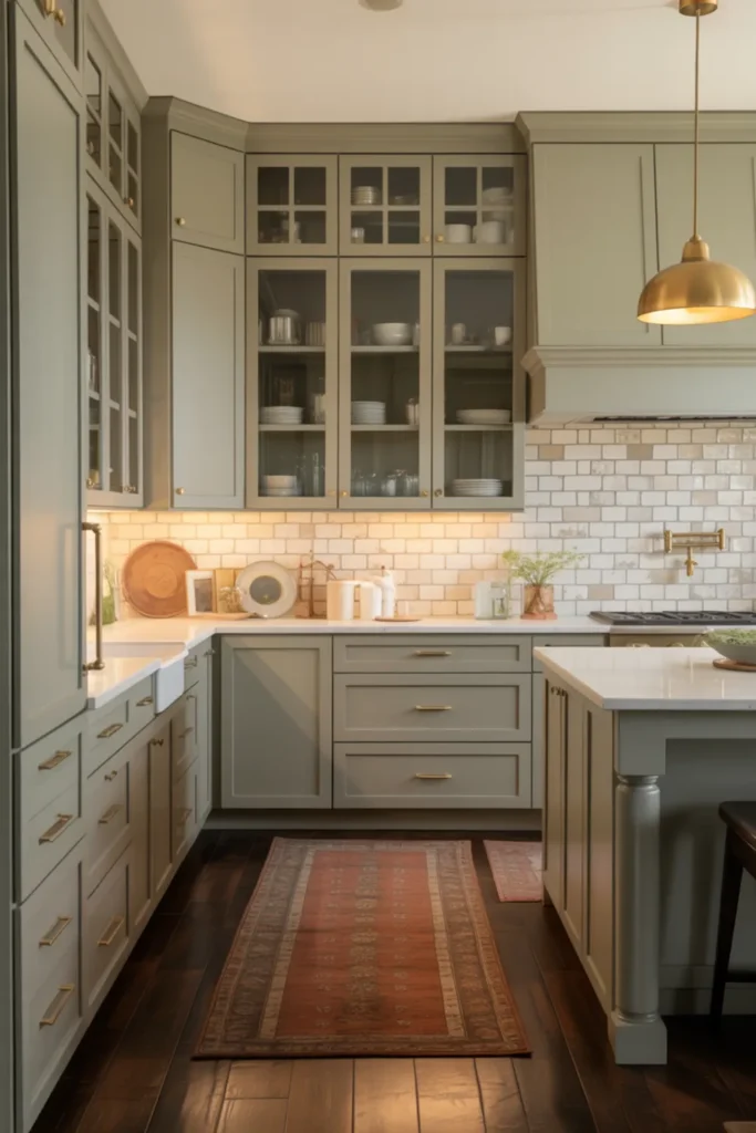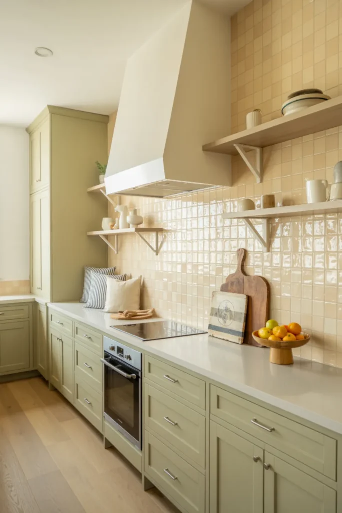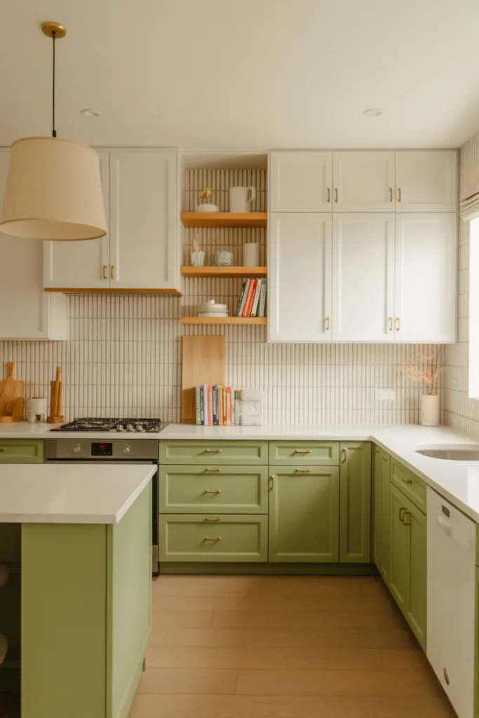 Choose a sage or olive tone for the lowers, then add white quartz countertops so it feels clean and modern. A warm white backsplash, like vertical stacked tile, helps the whole setup feel taller.