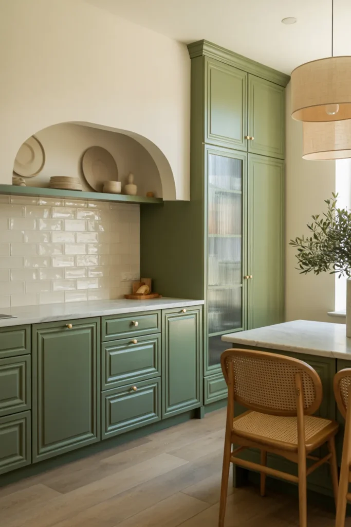 A built-in coffee bar or a small open shelf section is a nice way to break up the green. Keep styling simple with neutral ceramics, so the hardware finish stands out naturally.