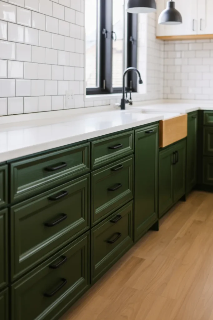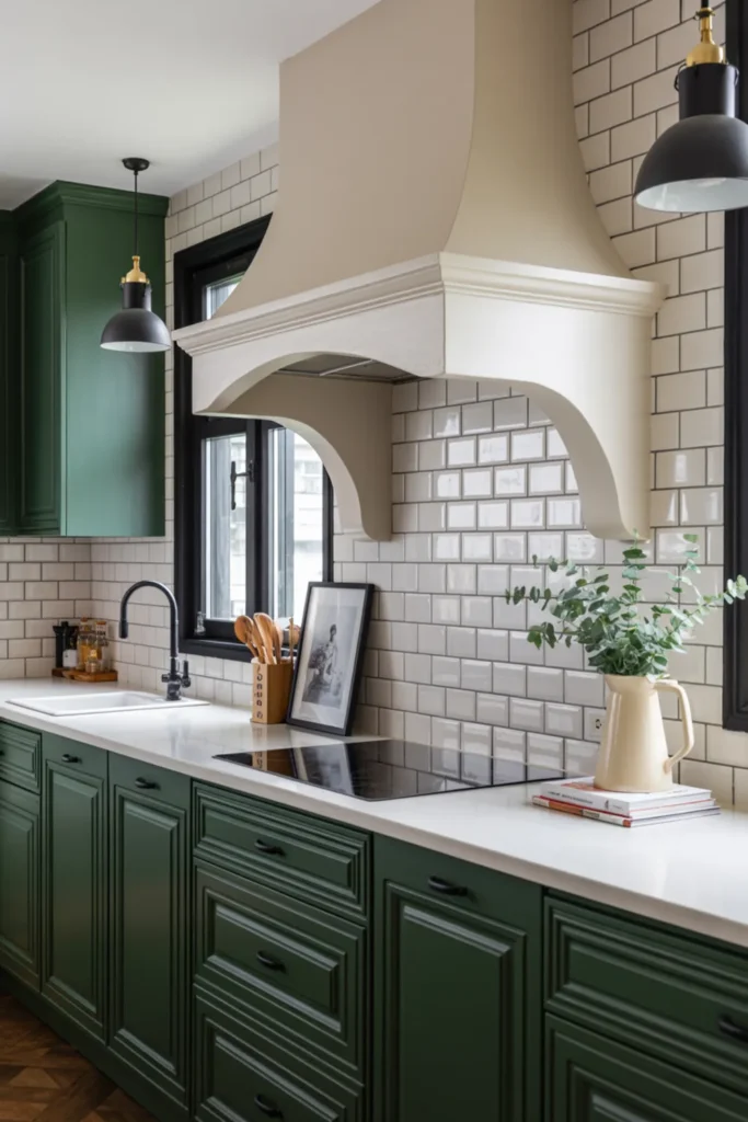 Bottle green kitchen cabinets feel rich and classic, and white subway tile keeps the look clean. Use warm gray grout so the tile doesn’t feel too sharp.