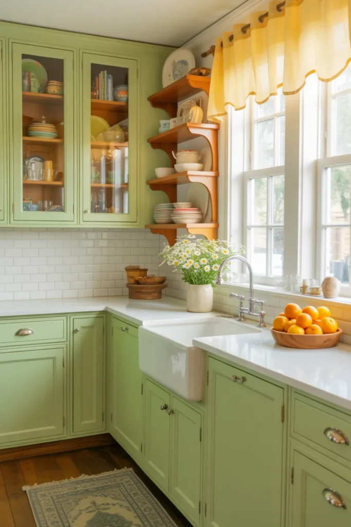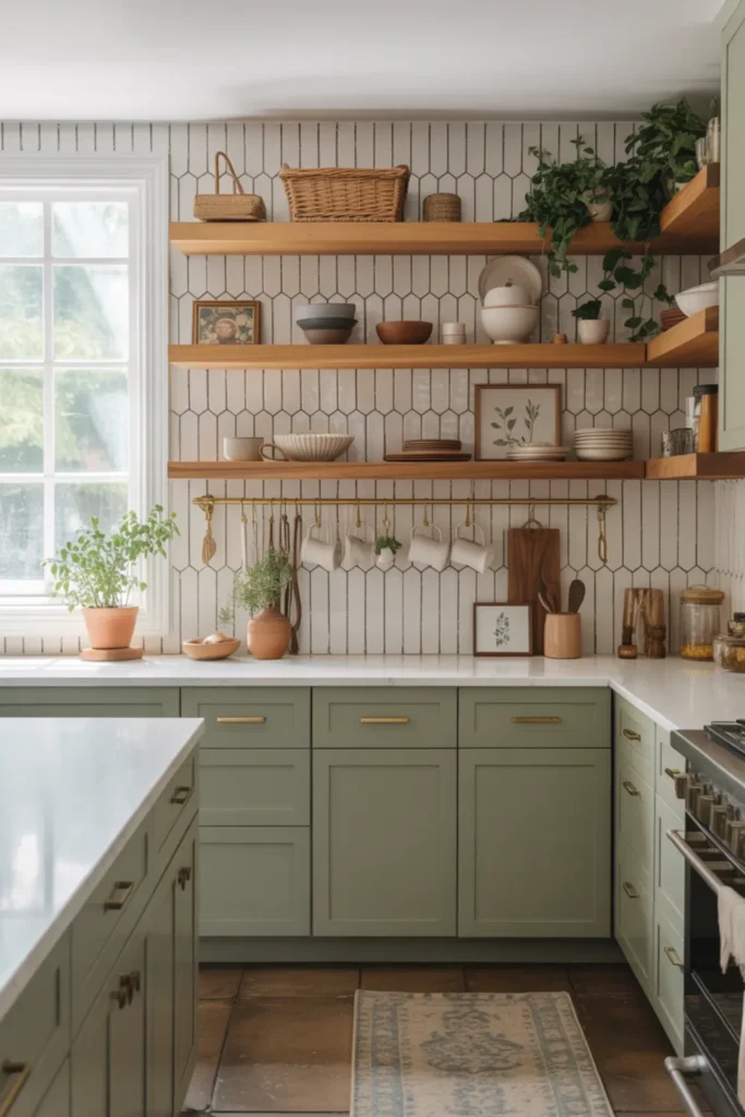 This combo feels light, practical, and very Pinterest-friendly. Green lower kitchen cabinets give you storage where you need it, while open shelving keeps the wall from feeling boxed in.