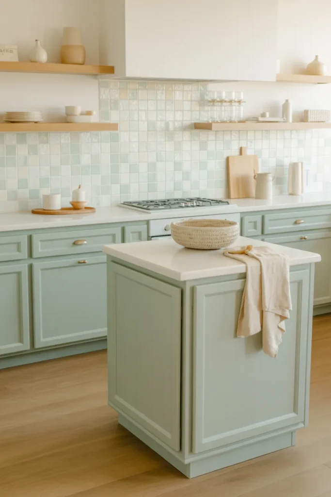 Seafoam green cabinets give you that calm, airy vibe that works in both modern and cottage kitchens. Soft white walls keep the color from turning too blue.
