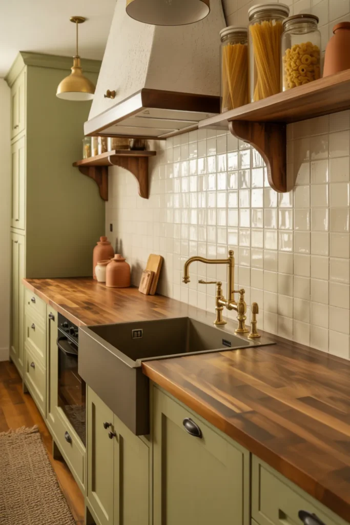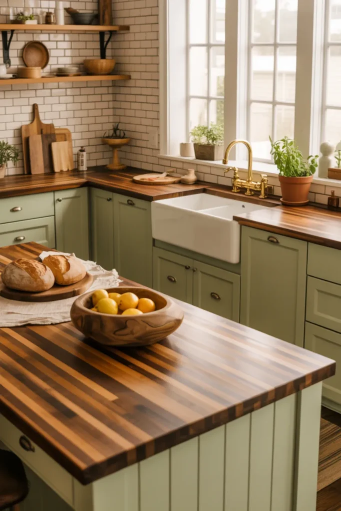 Green kitchen cabinets with butcher block countertops feel warm, cozy, and super livable. Sage or olive cabinets work best because they blend with the wood tone instead of fighting it.