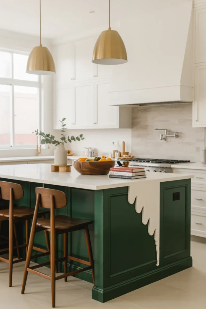 Deep forest or hunter green looks amazing with white countertops and a soft, neutral backsplash. Add warm wood stools and simple pendants so the island feels like the center of the room.