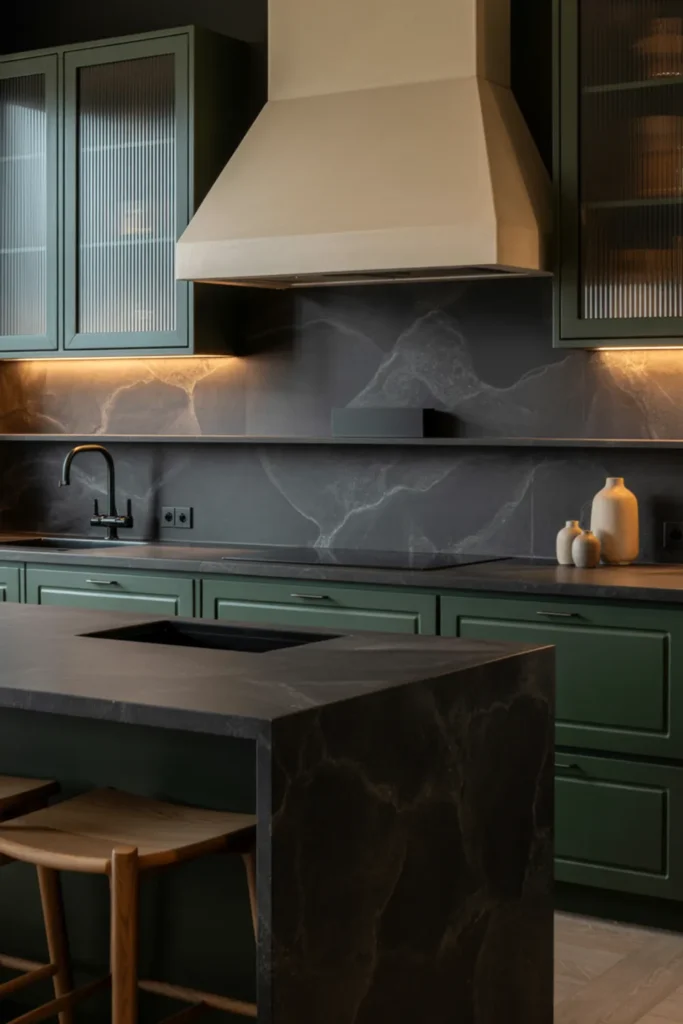 2. Dark Green Kitchen Cabinets With Black Countertop Contrast