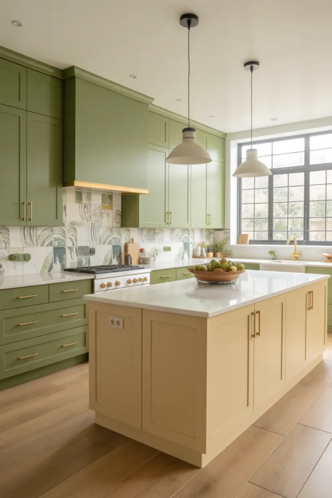 Two-tone doesn’t have to mean white and green. Keep your main cabinets a muted green, then pick a different color island like warm cream, soft charcoal, or pale wood.