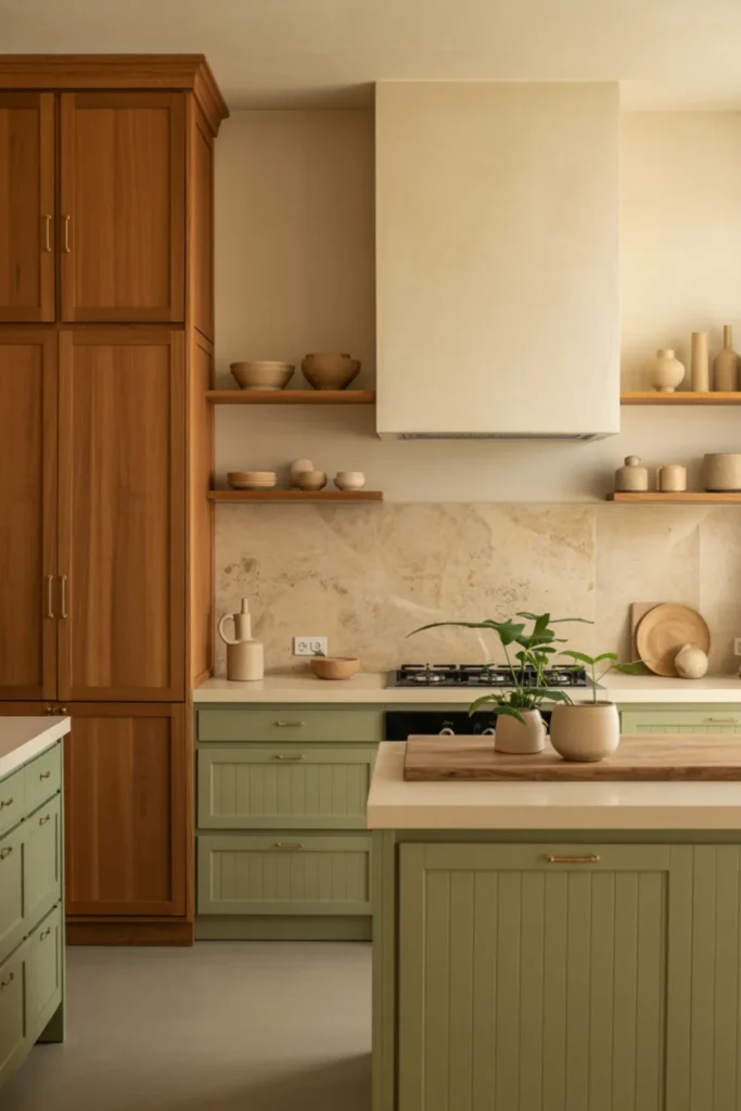 Green and wood kitchen cabinets are a cheat code for a cozy, high-end look. Use green base cabinets and warm oak uppers so the space feels grounded but still bright.